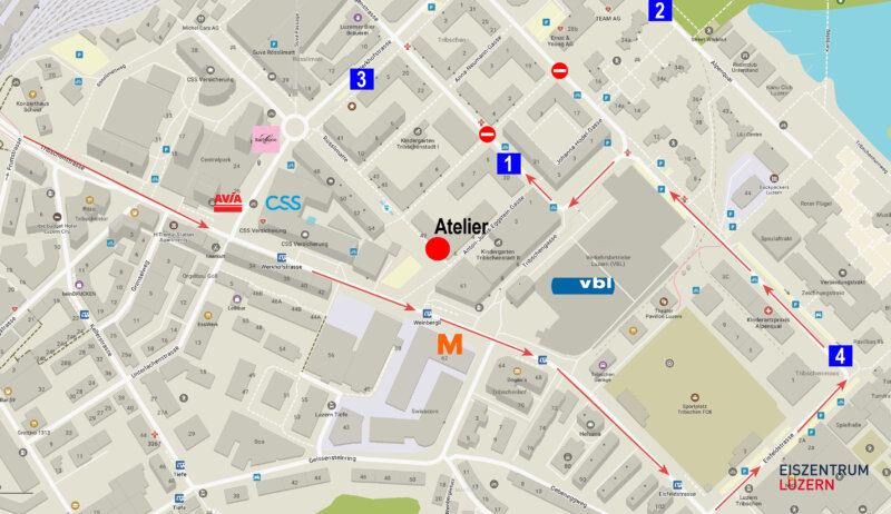 Mein Atelier liegt zentral zwischen Bahnhof, See und Eiszentrum, mitten in der lebendigen Tribschenstadt, Ecke Rösslimatte/Anton-Julius-Eggstein-Gasse, vis à vis Swisscom. Es ist hell, modern und trotzdem charmant und mit ÖV (Nr. 6./7./8, Haltestelle Weinbergli) wie auch per Auto gut erreichbar. Besucherparkplätze gibt es direkt auf der Rückseite des Gebäudekomplexes an der Bürgenstrasse 30 (Zufahrt über Eiszentrum/Kantonsschule/Emmi). Weitere Parkmöglichkeiten gibt es in weniger als 5 Minuten Laufdistanz.