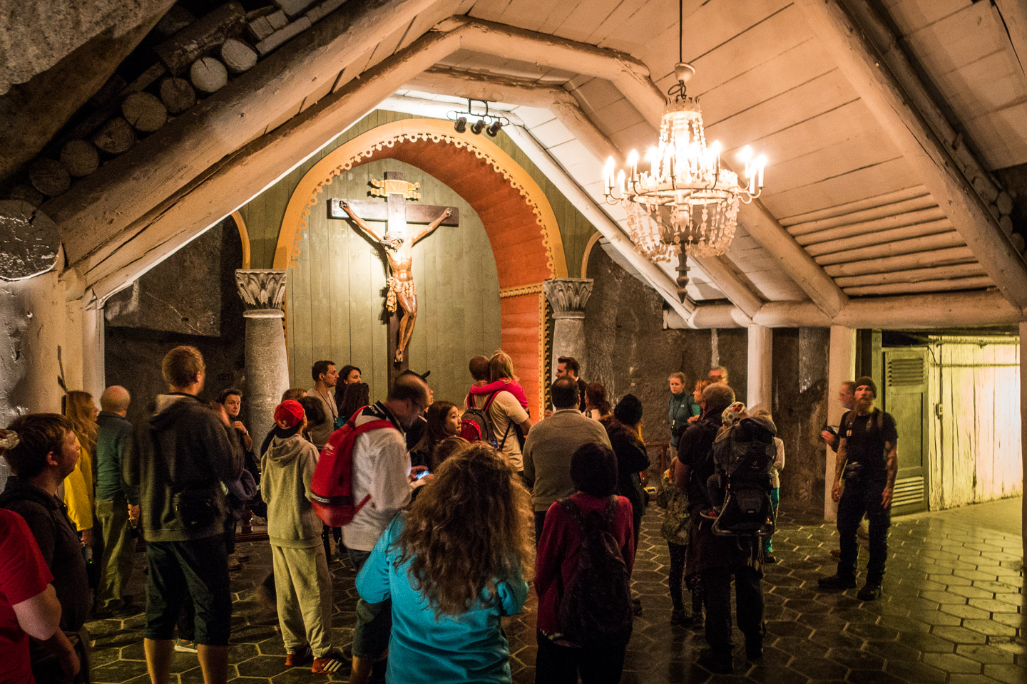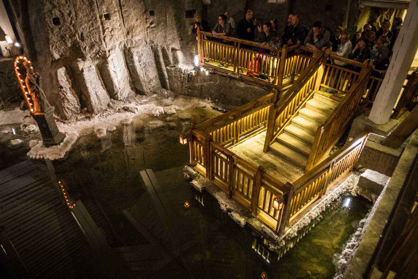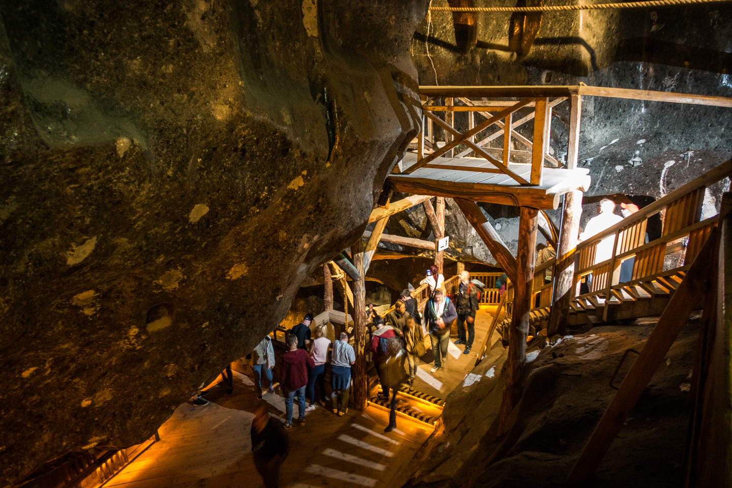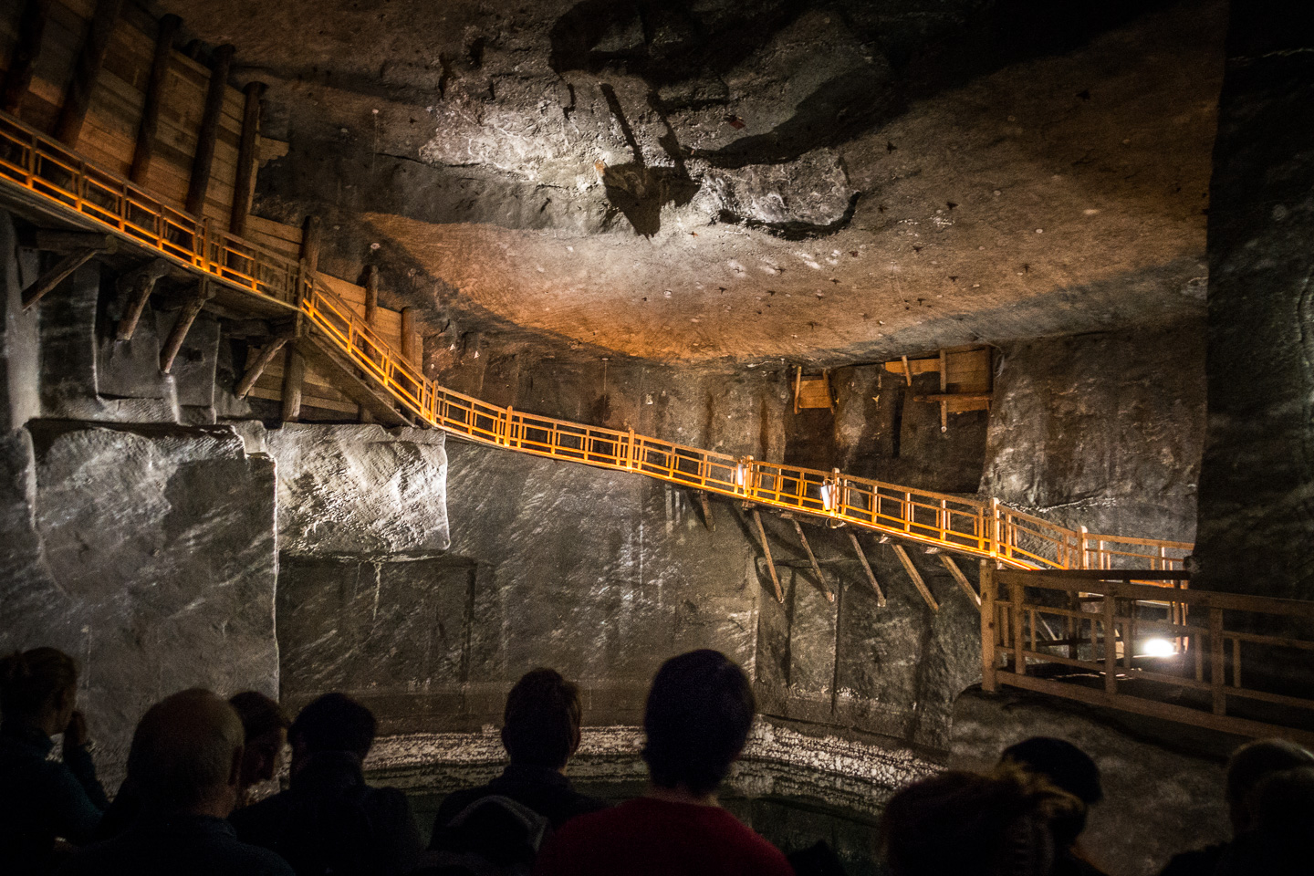 Nach zwei Stunden anstehen und warten gehts endlich über eine Holztreppe 350 Stufen und 130 Meter in die Tiefe. Auf der dreistündigen Tour kommen wir an in Salz gehauene Statuen und unterirdischen Seen und einer Kapelle vorbei. Der Tourguide erklärt uns in englisch und in witziger Art, dass man ungeniert Boden, Wände oder Decke abschlecken dürfe. Dass die salzige Luft gut für die Lunge sei und das Leben um ganze drei Tage verlängern soll. Und dass man unbedingt in der Gruppe bleiben müsse, da man sich sonst schnell in den endlosen Gängen verlaufen könnte. Dank verschiedenen Stationen mit nachgestellten Szenen der harten Arbeit der Minenarbeiter lassen sich die Arbeitsbedingungen der letzten Jahrhundert gut nachvollziehen. Am beeindruckensten fand ich aber die riesigen unterirdischen Hallen, welche bis zu 70 Meter in die Höhe ragen. Eine davon ist eine unterirdische Kirche, welche komplett in Salz gehauen ist. Boden, Wände, Figuren, sogar der Altar, alles aus reinstem Speisesalz.