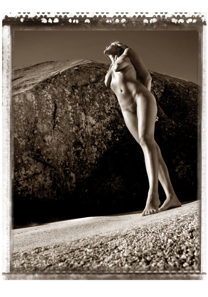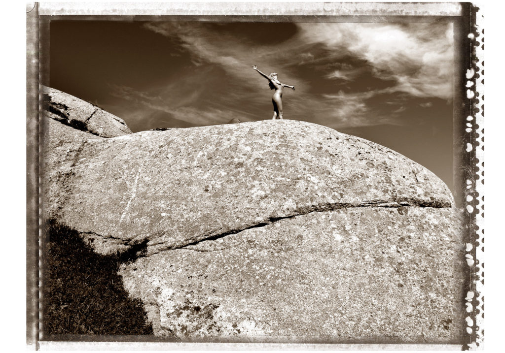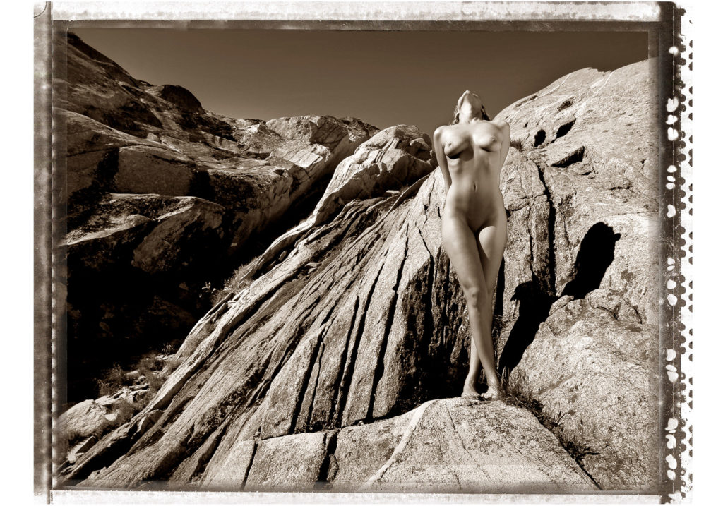 Noch vor den Zeiten von Photoshop und digitaler Fotografie. Irgendwo in den Schweizer Bergen. Zwischen imposanten Felslandschaften und steilen Hängen. Eine Fotoserie wie ich schon lange davon geträumt hatte. Mit etwas Glück hatte ich ein Modell gefunden, welches schwindelfrei und dazu noch nackt den Mut hatte, über die steilen Felsen zu balancieren. Keine einfache Angelegenheit. Auch ich musste auf der Suche nach dem richtigen Standort nicht ganz ohne Risiko über die Felsen klettern. Während meine Assistentin versuchte, das harte Licht und die Schatten mit einem grossen Reflektor etwas aufzuhellen. Einzig beobachtet von einem Helikopter in höhen Lüften, der verdächtig oft über uns kreiste.